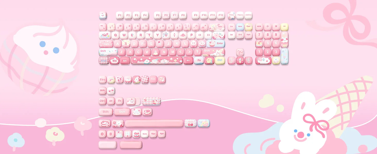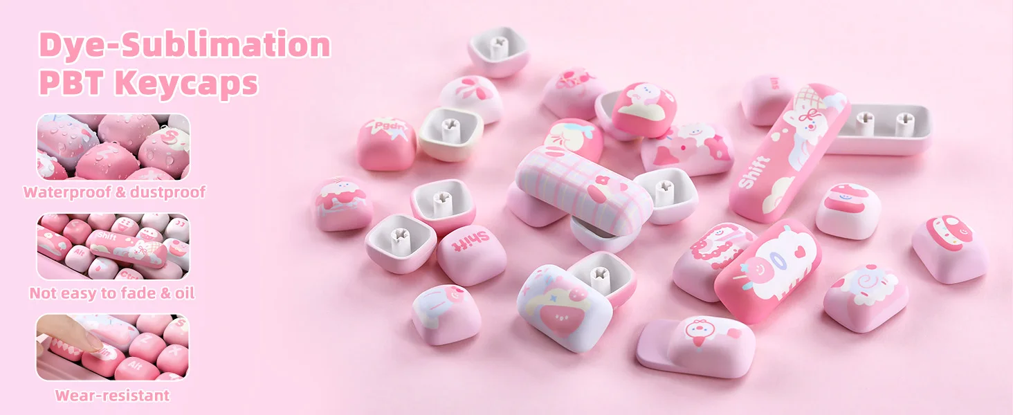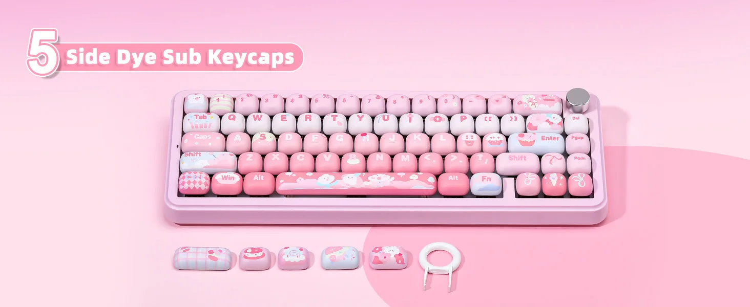 YUNZII MOG keycaps feature a pink ice cream design, with fresh and cute patterns that add lively and jumping colors to the keyboard, creating a playful and cheerful vibe for typing.
