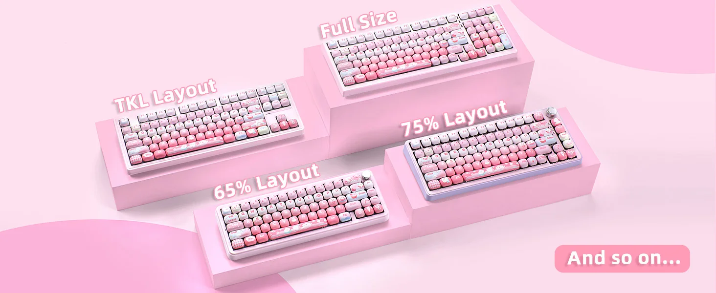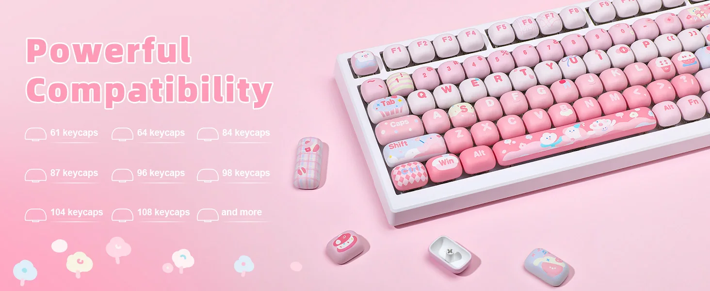 YUNZII Full-key Keycaps have a total of 136 keys, suitable for any size mechanical keyboards, such as 61/87/104/108/84/64/98/96, and full-size mechanical keyboards, and are fully compatible with MX switches, including switches like Cherry, Gateron, Akko, and Kailh, making it the perfect keycaps set for DIY keyboards.