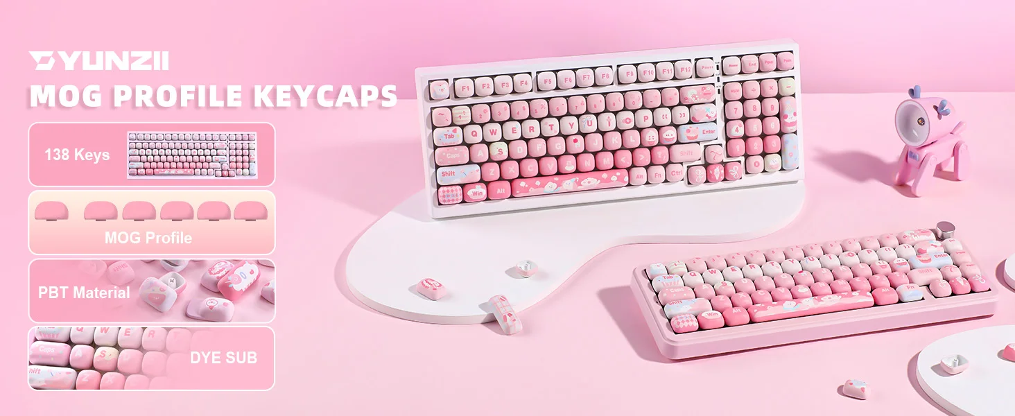 YUNZII Pink Ice Cream MOG Custom Keycaps, 138 Keys Dye Sub PBT Cute MOG Profile Keycap Set for Mechanical Gaming Keyboards